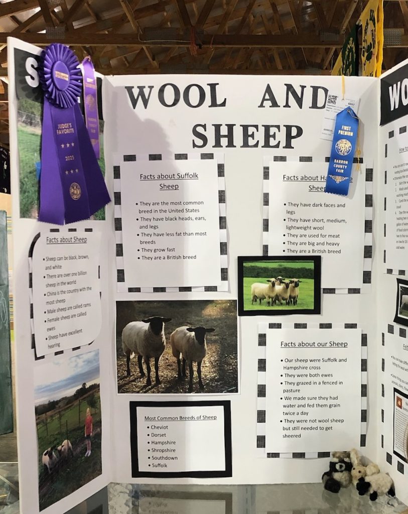Congratulations to our very own Barron County Fair entrant who earned PURPLE on this Wool and Sheep Educational display. White Pine Wool kits were even a part of it! Beautifully done! – July 2025