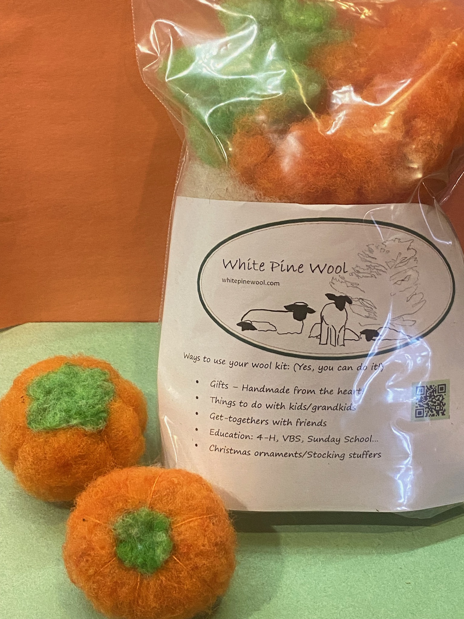 Make two small (2″ diameter) pumpkins or combine materials into one medium pumpkin.Instructions (online version):Core – (Cream) Divide in ½.  Roll each section into a 2” wide ball and prick with the felting needle until it holds together.Outside – (Orange) Divide in ½; Wrap each ½ around a ball and felt it into place.Ridges – (Orange Floss) Cut in ½ (about 10”). For each ½, put a knot at one end, and use a large-eyed needle to thread the other end.  Starting at the center bottom of each pumpkin, pull the thread through the pumpkin so the end is hidden, then bring the threaded needle back down through the pumpkin next to this spot and remove the needle.  Separate the 6 threads of the embroidery floss, and for each thread, thread it on the needle, reach it around to the top center of the pumpkin and bring it down through the center of the pumpkin.  When finished, all 6 threads should be coming out the bottom of the pumpkin.  Thread these once again on the needle, bring through the pumpkin to the top, knot, trim, and push back into the pumpkin.Stem – (Green) Using ½ the green, felt to the top of the pumpkin, either in the shape of the stem or the shape when the stem is broken off.